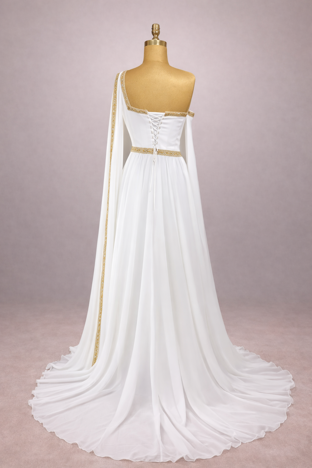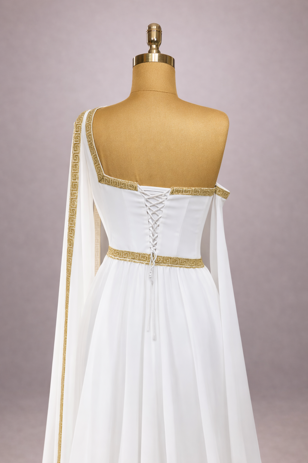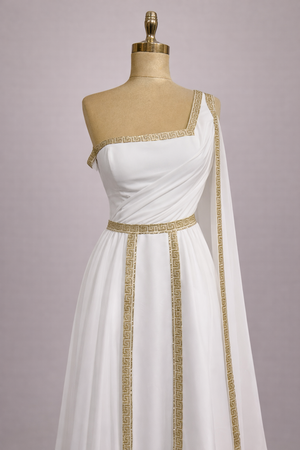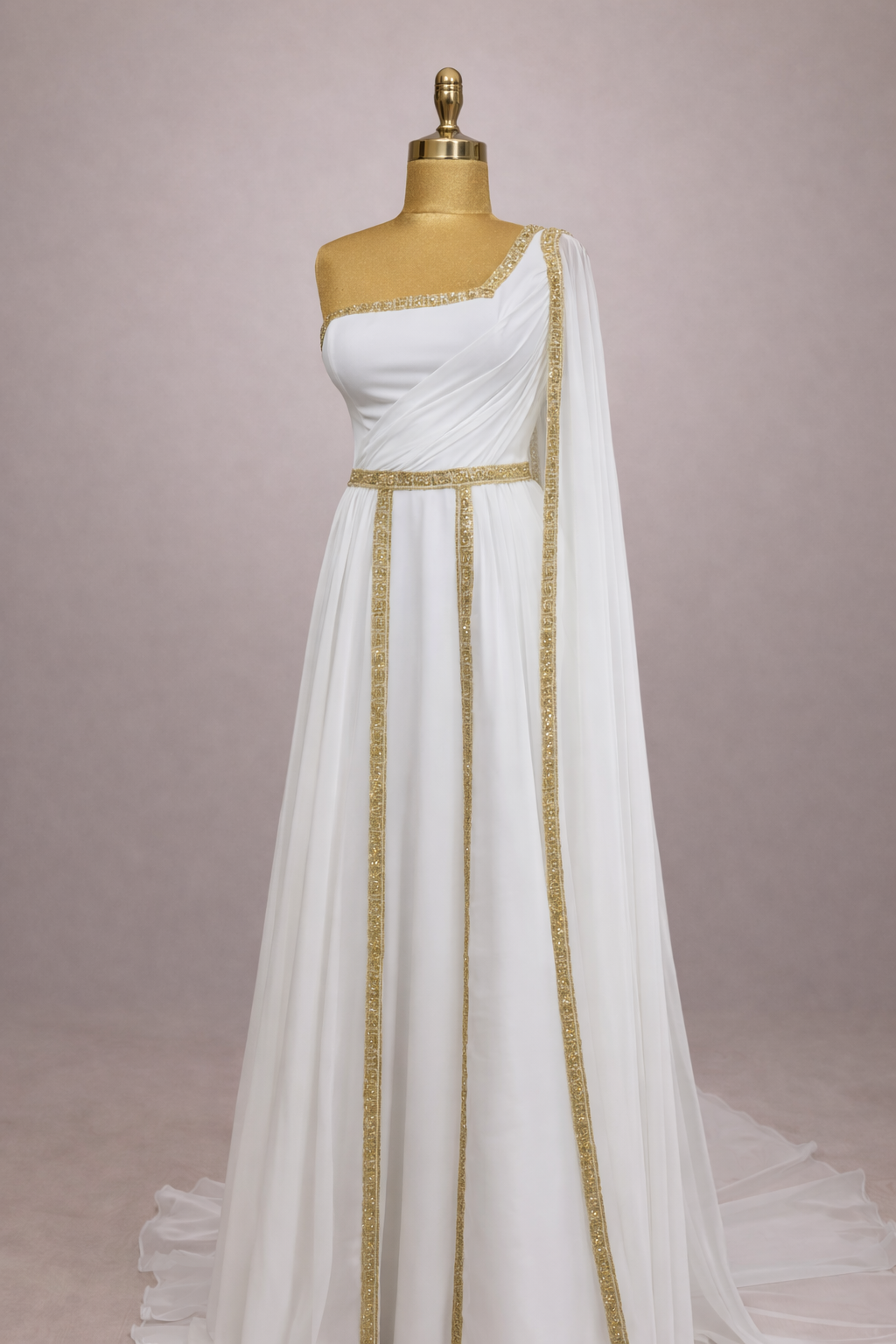 La jupe fluide en mousseline légère accompagne chaque mouvement avec élégance, créant une silhouette élancée et aérienne. Le drapé asymétrique sur l’épaule se prolonge en un voile délicat qui descend le long du dos, ajoutant une dimension majestueuse et une allure presque divine.