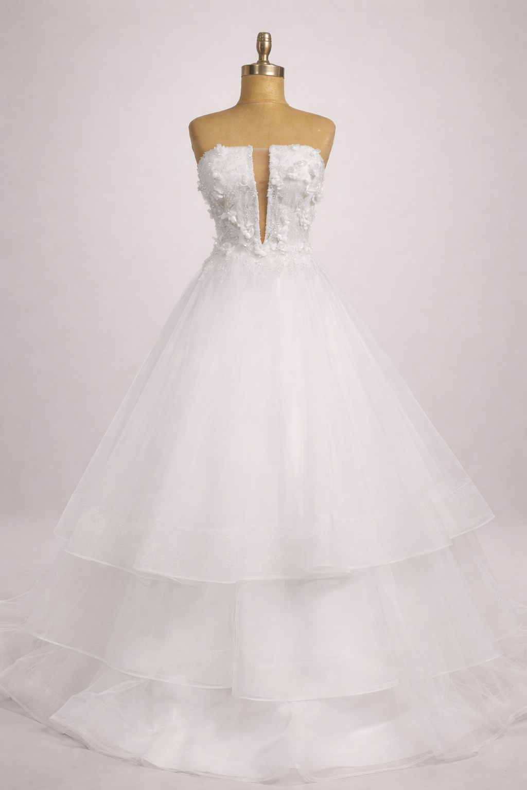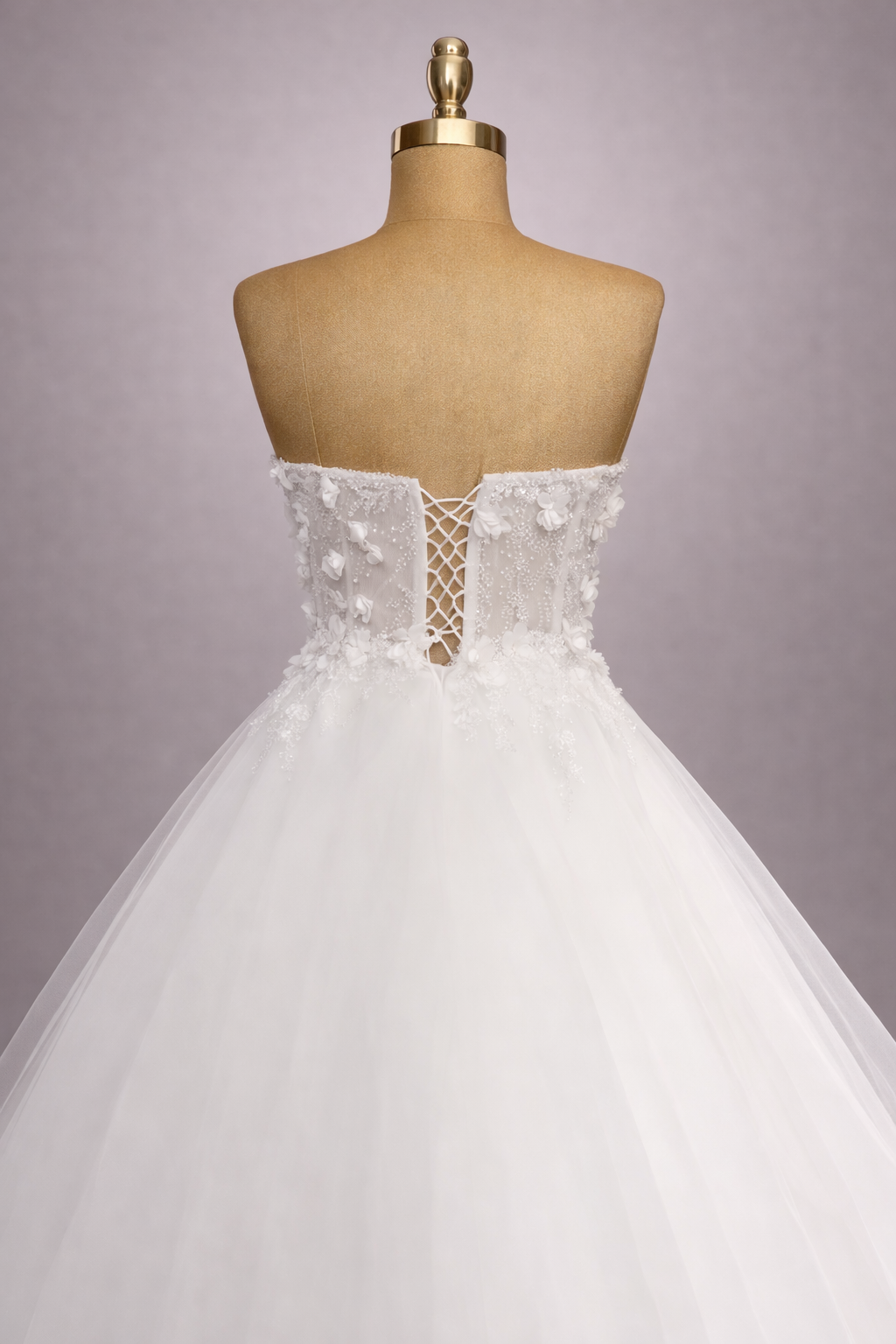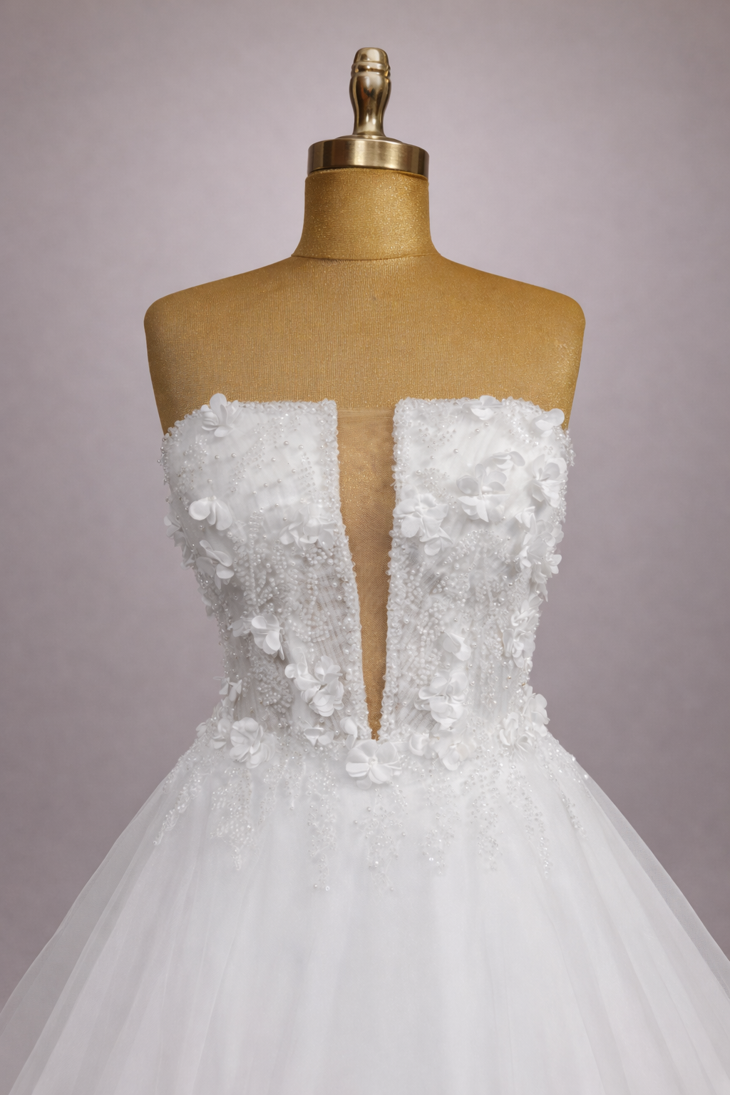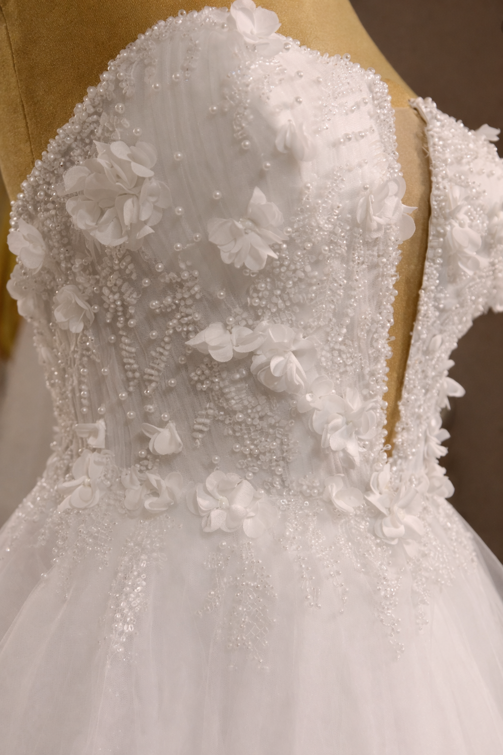 Son bustier structuré attire immédiatement le regard avec un décolleté plongeant en V, subtilement équilibré par un tulle illusion pour un maintien élégant. Il est entièrement recouvert de délicates broderies et de fleurs en relief 3D, accompagnées de perles et de sequins finement cousus, créant un effet de texture unique et lumineux.