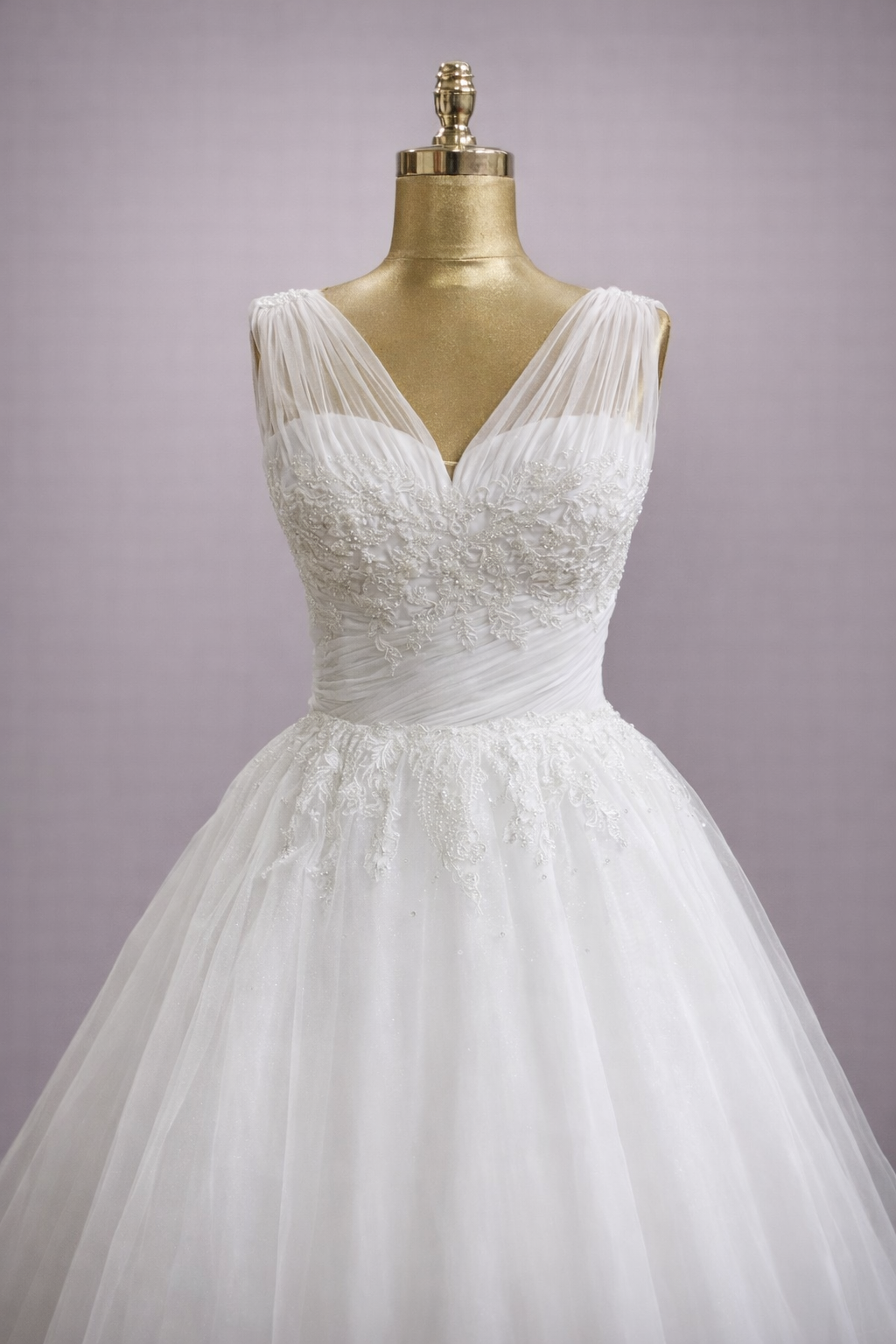 Orné de fines broderies et de perles discrètes, le haut de la robe capte subtilement la lumière, créant un effet lumineux et délicat. Le décolleté en V met en valeur le buste avec élégance, tandis que les larges bretelles en tulle apportent confort et maintien, tout en structurant harmonieusement le haut du corps.