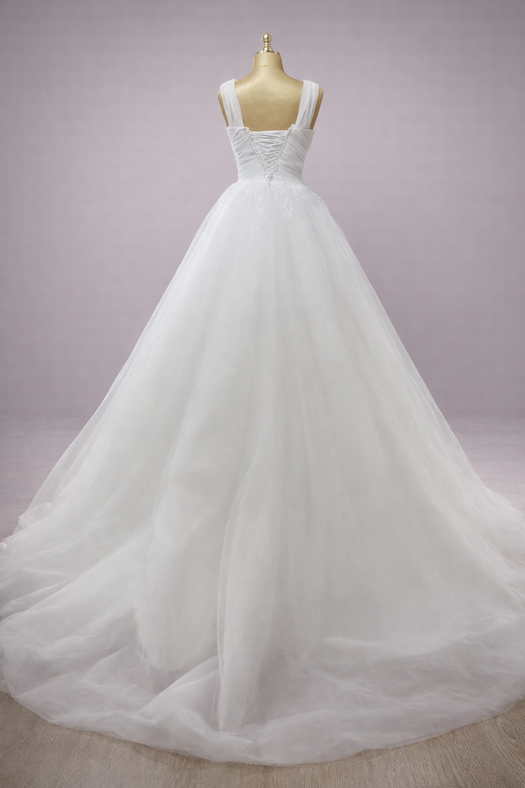 La taille marquée laisse place à une jupe en tulle fluide et aérienne, offrant une coupe princesse légère et romantique. À l’arrière, le dos présente un laçage discret, permettant un ajustement parfait et soulignant délicatement la silhouette.